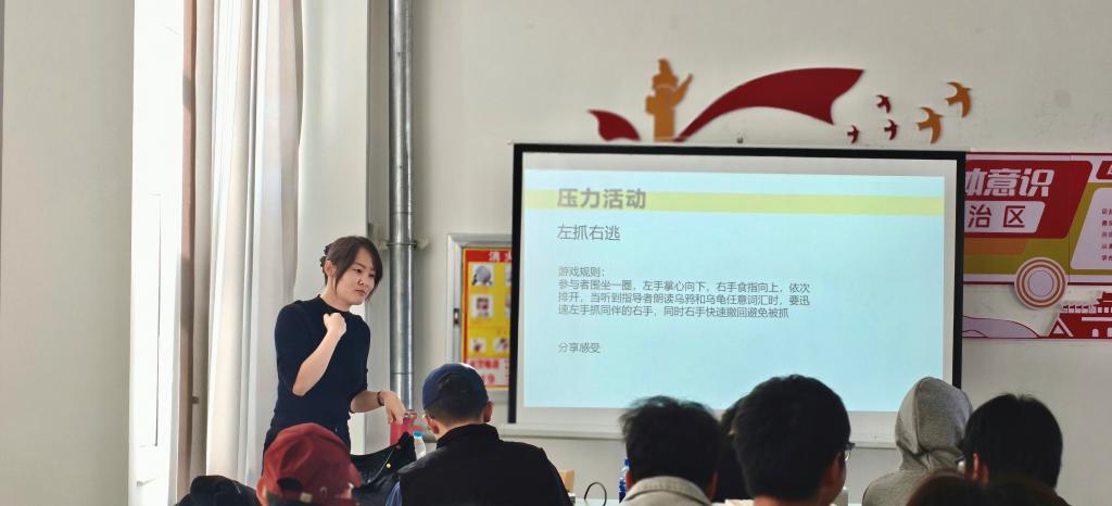 活动伊始,老师以轻松有趣的“谁和我一样”破冰游戏开场,迅速拉近了同学们之间的距离,营造出温暖融洽的氛围。随后,通过“你抓我逃”手指反应游戏活跃现场,并在舒缓的音乐冥想后,带领大家共同绘制“压力地图”,引导同学们直观觉察压力对身心的影响。分享交流环节中,同学们敞开心扉,坦诚诉说内心的困惑与感悟,老师认真倾听、耐心回应,用理解与共情为大家传递温暖与支持。活动最后,以“心有千千结”游戏收尾,让同学们在互动中真切体会到人际支持与团结协作的力量。