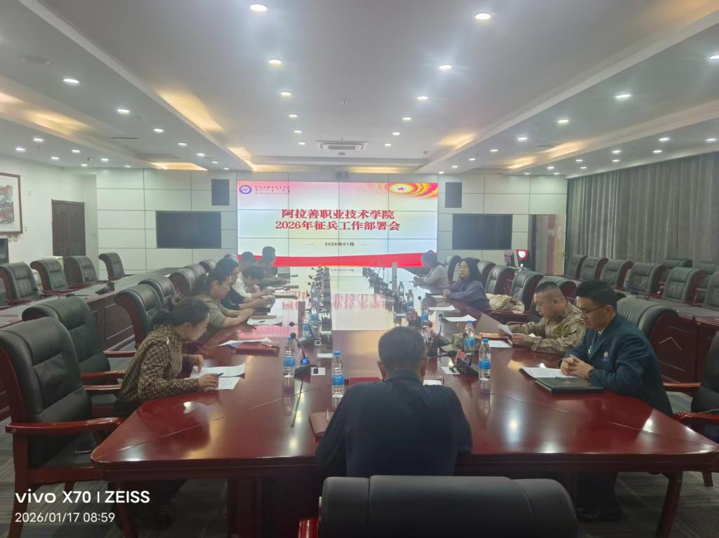 为深入贯彻习近平强军思想,严格落实党管武装工作要求,切实承接2026年全国征兵动员令及自治区、阿拉善盟征兵工作任务,1月17日上午9时,我院隆重召开2026年征兵工作部署会。会议立足建军一百年奋斗目标攻坚战关键之年的时代背景,统筹国家国防建设、地方强边固防需求与学院人才培养、学生个人发展实际,明确任务分工、压实工作责任,为全年征兵工作高质量开展筑牢根基。